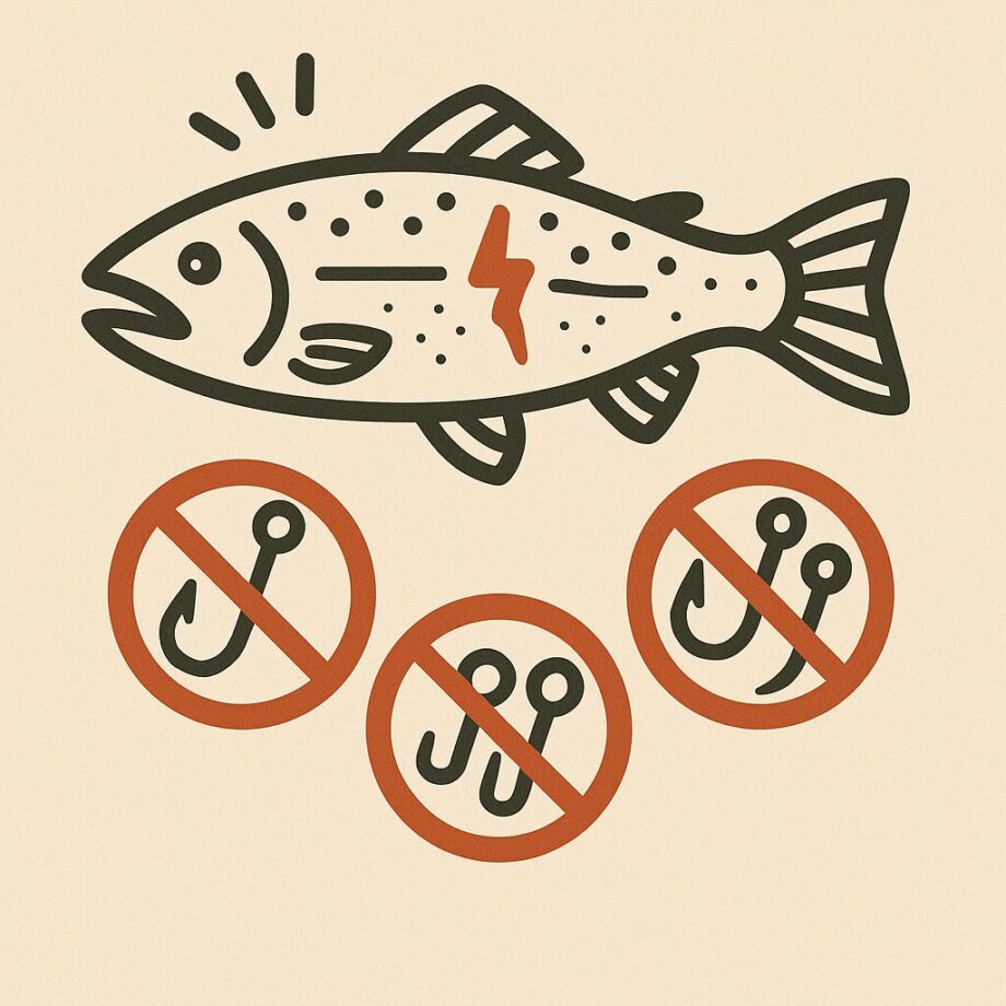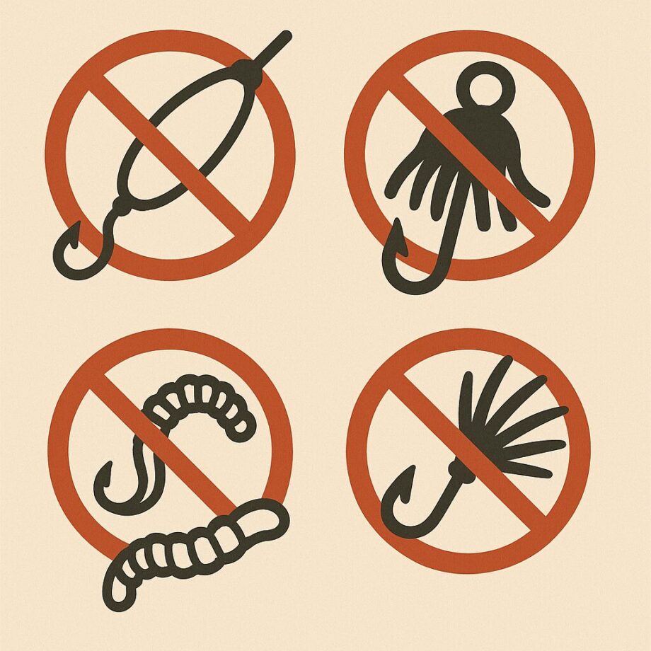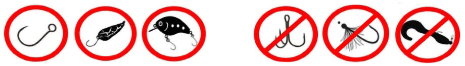 シングルバーブレスフック(返しなし)のみ使用でき、トリプルフックやワーム、起毛素材のルアーなどは禁止 となっています。